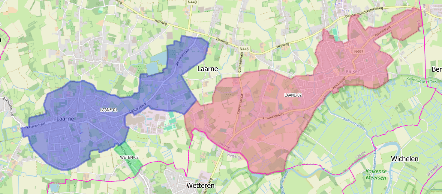 Het aansluitbare gebied in Laarne werd opgedeeld in 3 zones (klik hier om het kaartje te vergroten). Iedere zone heeft z'n eigen fibercentrale. Zo'n centrale kan tussen de 2500 en 3000 adressen voorzien van fiber. Alle cabines zijn geplaatst en operationeel.