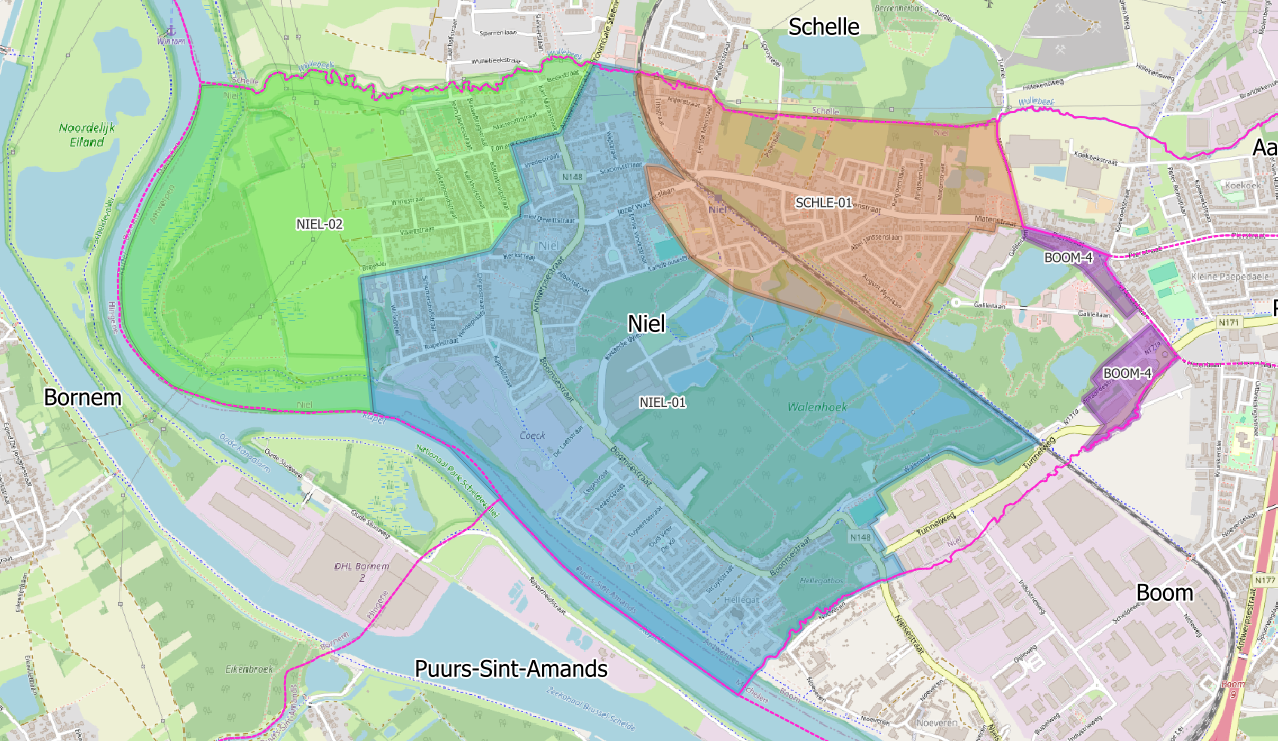Het aansluitbare gebied werd opgedeeld in vier fiberzones (klik hier om het kaartje te vergroten). Iedere zone heeft zijn eigen fibercentrale. Zo’n centrale kan tussen de 2500 en 3000 adressen voorzien van fiber. Alle centrales staan reeds op hun plaats.